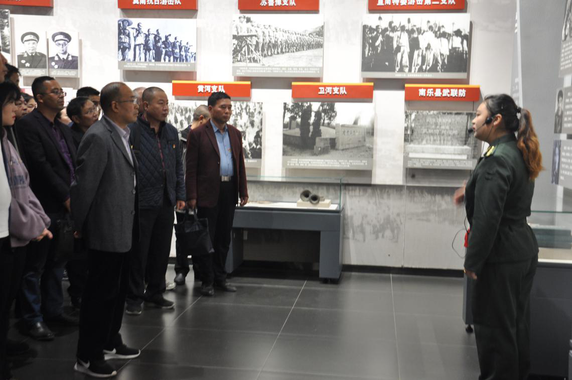上午10时许,一行人首先到达位于濮阳市清丰县双庙乡单拐村,走进冀鲁豫边区革命根据地旧址纪念馆接受革命传统教育。这里是全国爱国主义教育示范基地、全国重点文物保护单位、河南省红色旅游经典景区。抗日战争后期和解放战争初期(1944.9—1946.10),这里是中共中央北方局、冀鲁豫分局、冀鲁豫军区司令部暨军区第一兵工厂所在地,是一代伟人邓小平和老一辈无产阶级革命家黄敬、宋任穷、王宏坤、杨勇、苏振华等领导同志生活战斗过的地方。这里成功制造了我军兵工史上第一门大炮——“盖亮号”九二式七十毫米步兵炮,为革命事业走向成功立下汗马功劳。单拐村作为冀鲁豫边区抗战大本营,经历了血与火的洗礼,见证了边区军民同舟共济、艰苦奋斗的曲折历程,记录了边区军民在共产党的领导下不屈不挠、顽强抗战的历史。