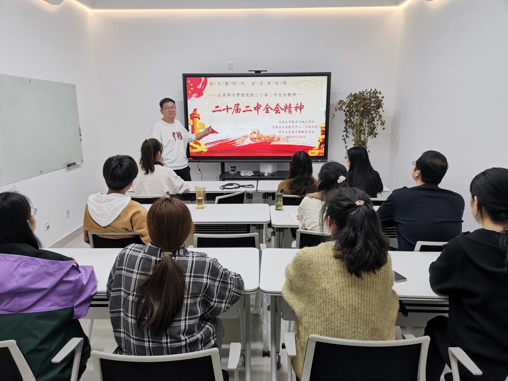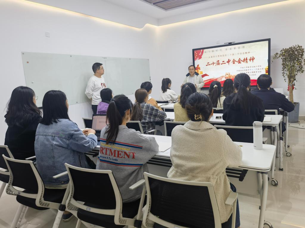 3月8日晚,河南省应用数学中心在郑州龙子湖校区九章学堂C座302召开专题学习会议,深入学习领会贯彻党的二十届二中全会精神,省应用数学中心执行主任肖运海教授、研究生班主任黄琼敖老师、中心全体研究生参会。