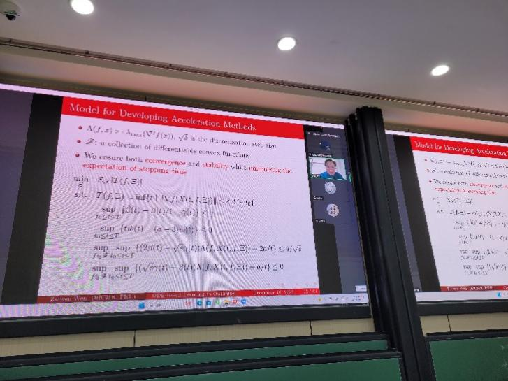 针对ODE和优化问题之间的联系以及软件Lean的使用,北京大学文再文教授通过腾讯会议以线上的方式进行了深入探讨和讲解。