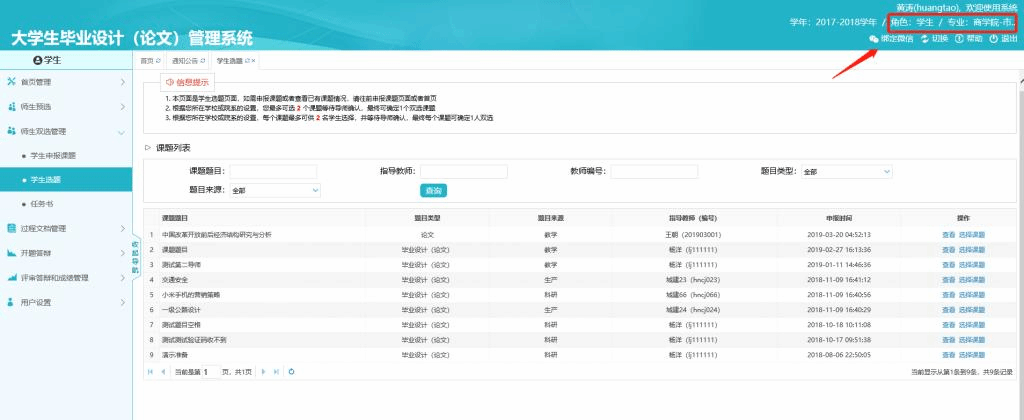 系统支持课题双选支持指导教师双选课题、指导教师指定学生课题、指导教师创建团队课题和学生课题