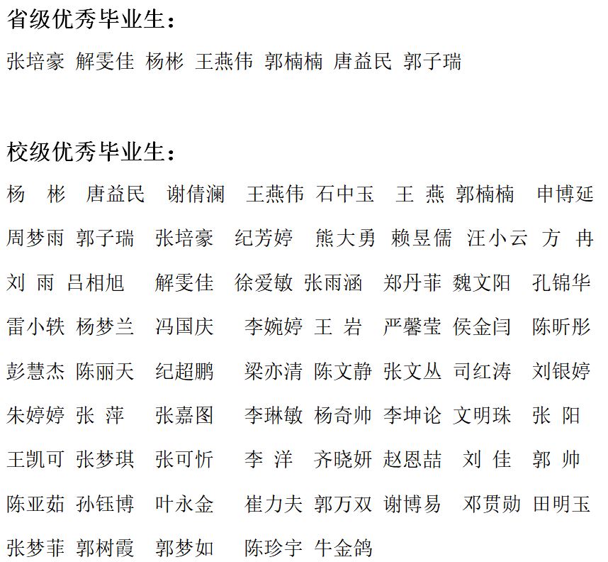 按照河南省教育厅关于评选<<河南省普通大中专学校2020年优秀应届毕业生通知>>要求及<<av麻豆 全日制普通本科生奖励办法>>的有关规定,2020届毕业生通过民主评议,特评出省级校级优秀毕业生和优秀实习生若干,予以公示如下:
