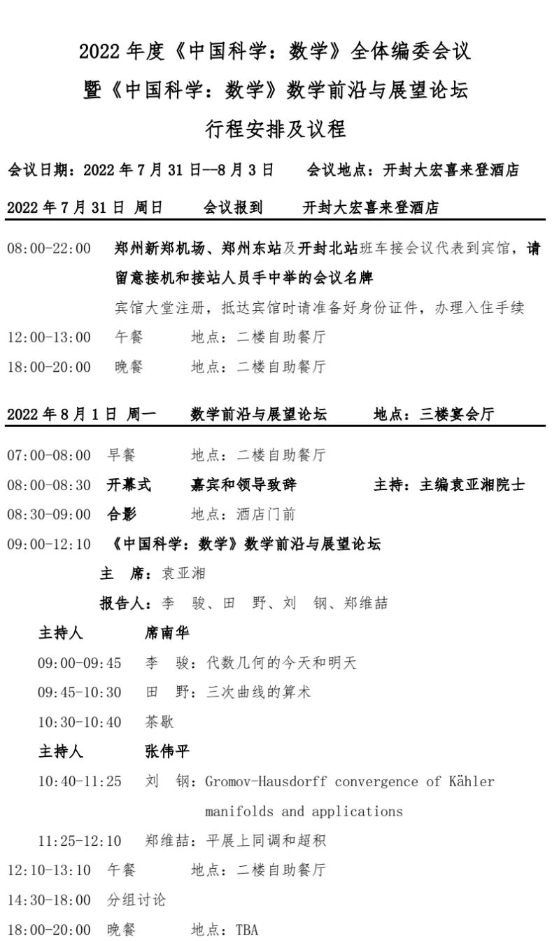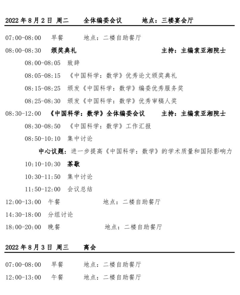 2022 年度《中国科学:数学》全体编委会议 暨《中国科学:数学》数学前沿与展望论坛 行程安排及议程