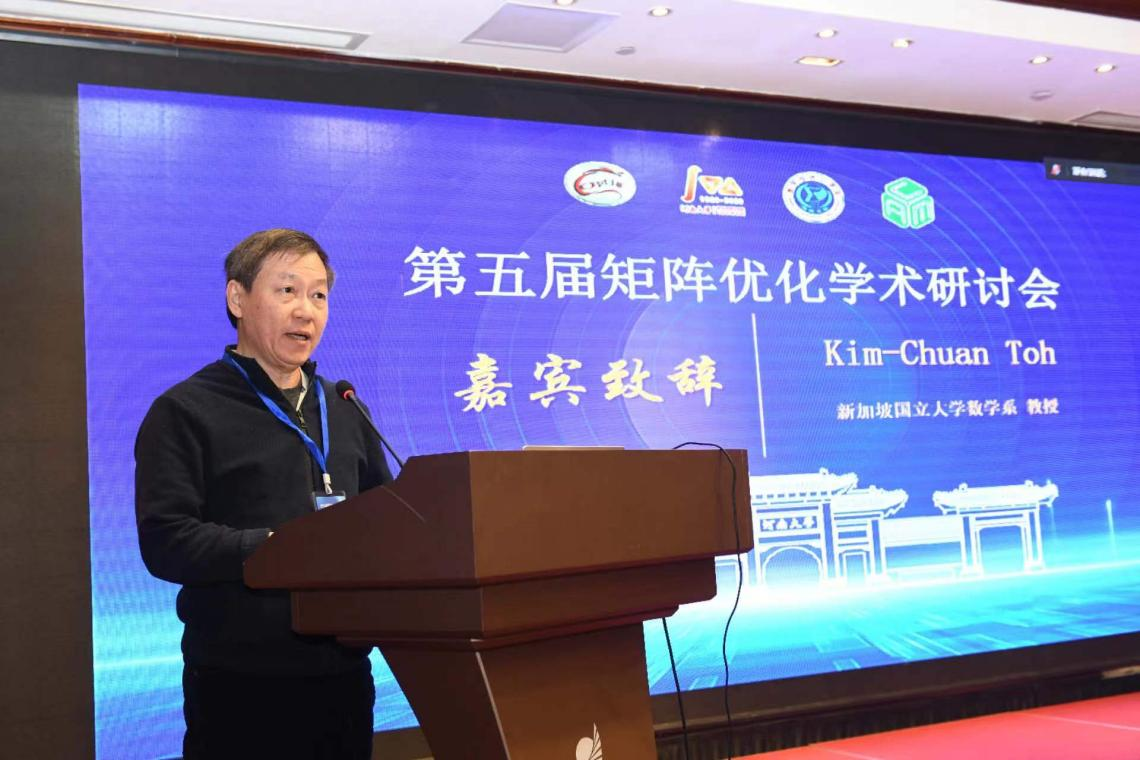 的发展情况,并预祝本次研讨会圆满成功。之后,新加坡国立大学Kim-Chuan Toh教授致辞。他向与会学者介绍了中国运筹学会数学规划分会的大致情况,期望矩阵优化领域相关的专家学者加强交流与合作。然后,他对各位报告嘉宾表示感谢,并预祝本次研讨会顺利举办。