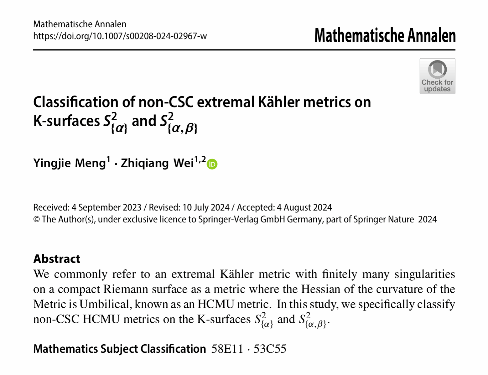 青年教师魏志强与其研究生孟盈杰在国际顶级数学期刊Mathematische Annalen(德国数学年刊)上在线发表了题为