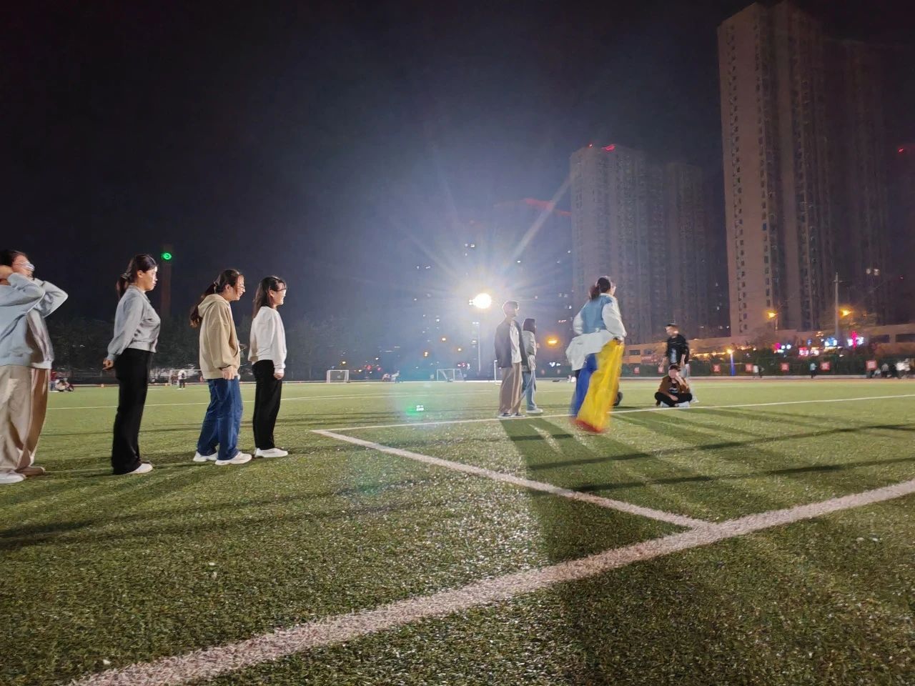 在袋鼠跳项目中,同学们通过一个大袋子接力跳跃前进。他们协调动作、保持平衡,在蹦跳中尽情释放活力和激情。