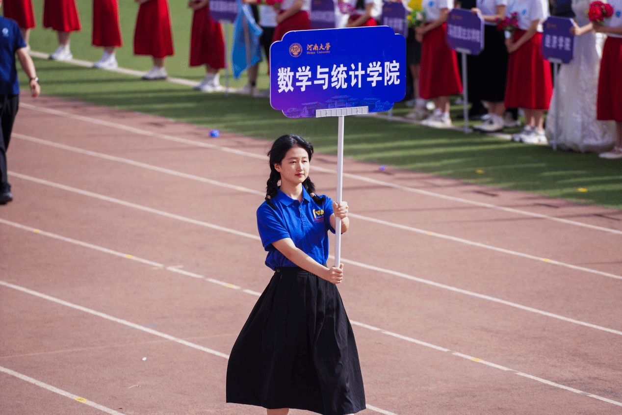 开幕式方阵中,学院代表队高举“求真悟理,推数致用”的院训格言,迈着矩阵般整齐有力的步伐,昂首阔步地走进操场,洋溢着自信与活力。