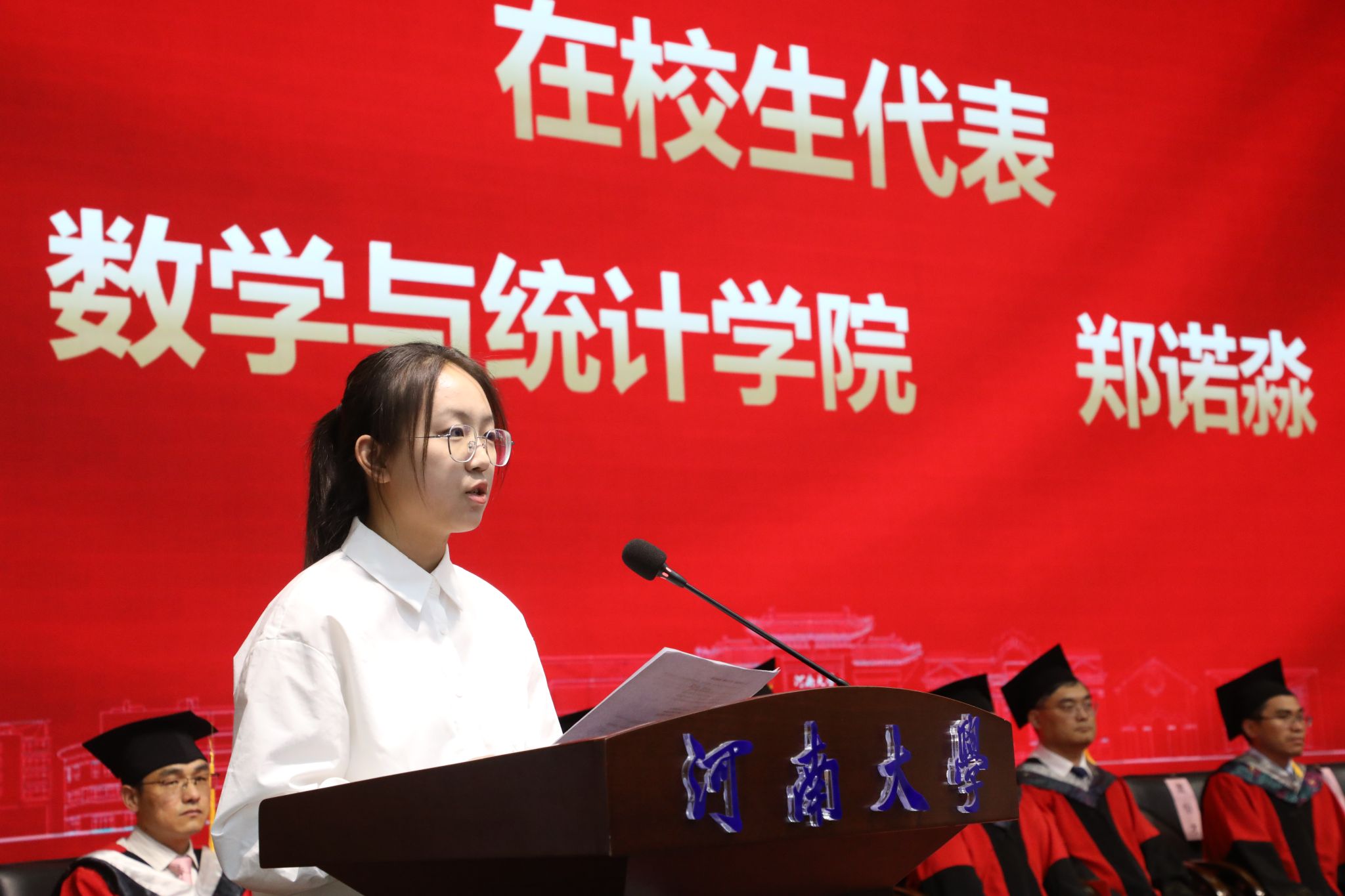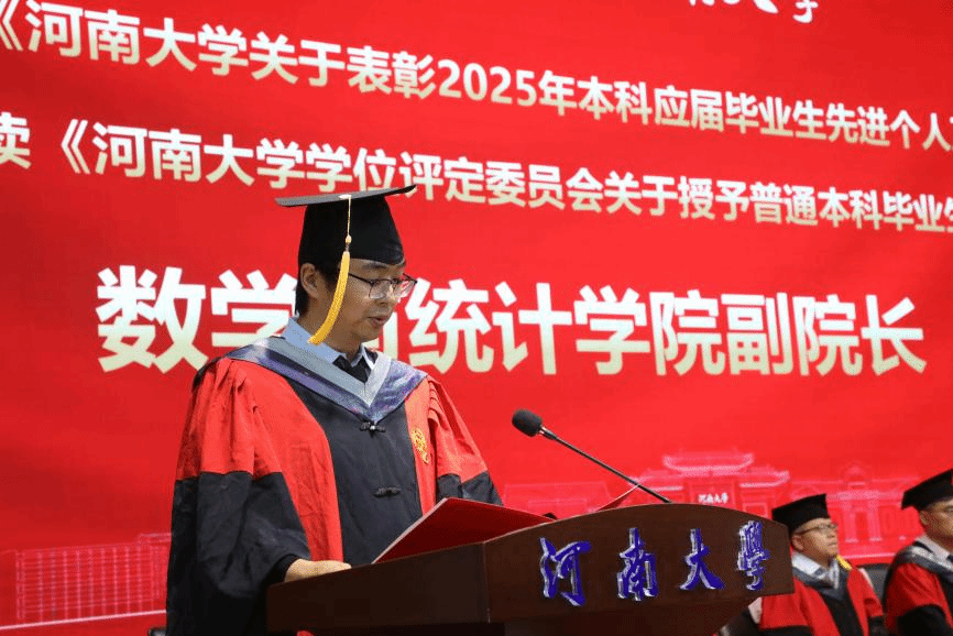 教师代表刘忠原结合自身经历,勉励毕业生们要心怀家国,将个人发展融入时代洪流,以数学人的方式服务社会、报效祖国;要勤于思考、善于发现问题并保持判断力;要用数学的坚韧和解决问题的智慧应对不确定性,坚持学习、锚定热爱。最后,寄语毕业生们用数学智慧照亮前路,用河大人的担当书写绚烂人生。