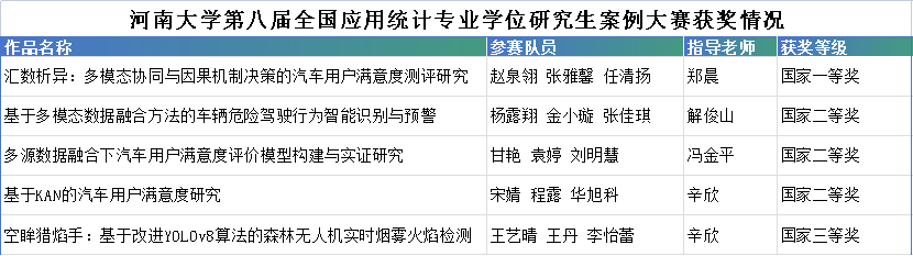 共有8支队伍获得华中赛区奖项、5支队伍获得国家级奖项。其中,由郑晨老师指导的《汇数析异:多模态协同与因果机制决策的汽车用户满意度测评研究》获得国家一等奖,另有3支队伍获得国家二等奖、1支队伍获得国家三等奖,包揽河南省所有国家级奖项。