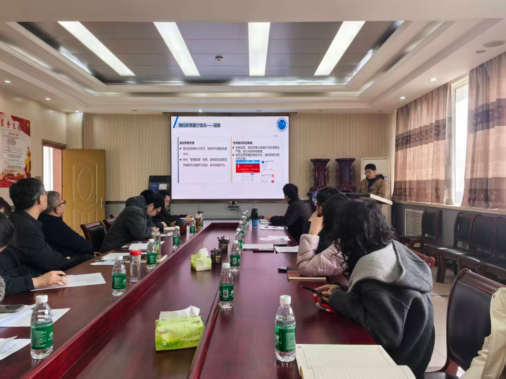 在学院二楼会议室召开2025年度辅导员工作考核会。学院领导班子成员、各系部主任、教师代表担任考核评委,学院全体本科生和研究生辅导员参加考核。会议由副院长杨一平主持。