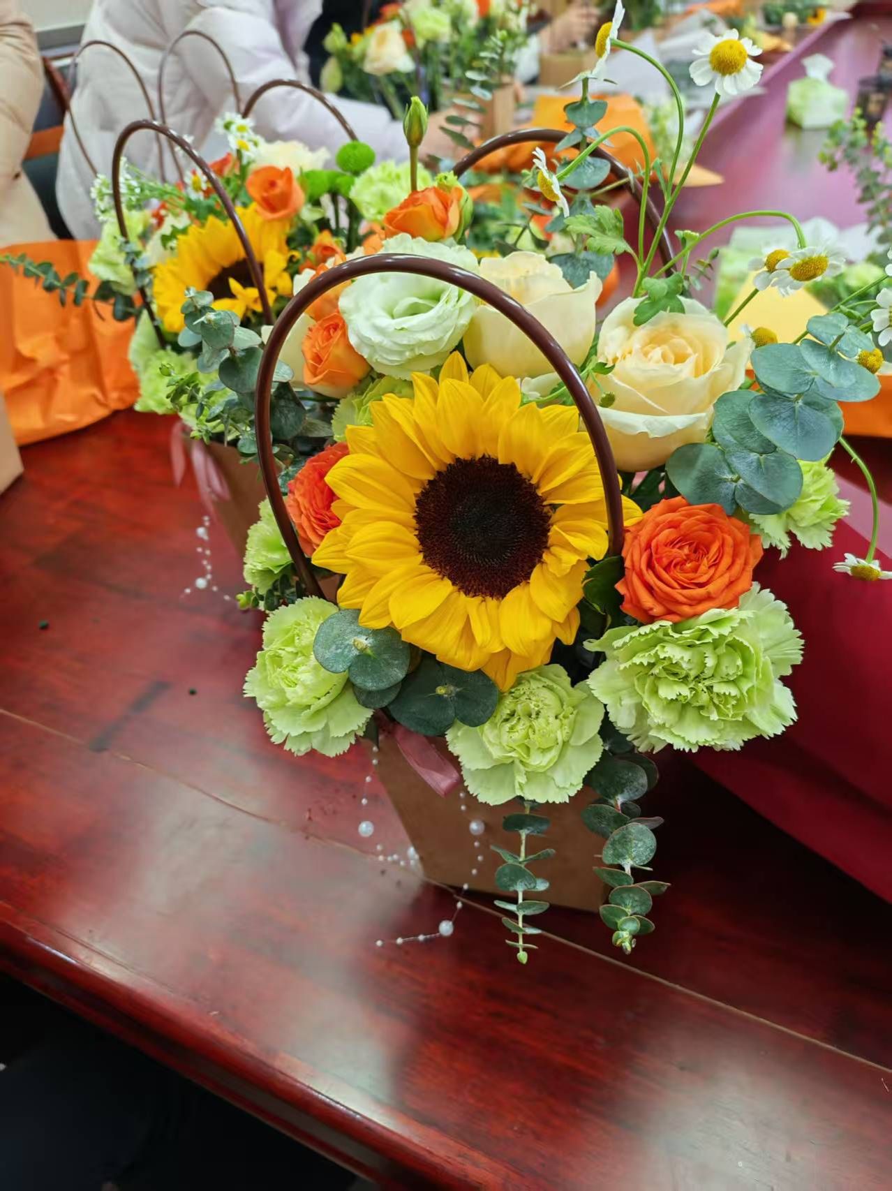 活动现场花香馥郁、氛围温馨。学院工会为大家准备了玫瑰、康乃馨、向日葵、洋桔梗、尤加利叶等丰富花材,并邀请专业花艺师现场指导。花艺师围绕插花的构图技巧、花枝修剪与层次营造等内容进行细致讲解,结合示范演示,手把手传授实操要点,让大家快速掌握插花基础要领。