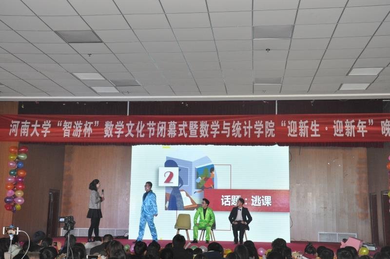 颁奖结束后,师生们以“我的大学,我的梦”为主题,分“立——启梦、守——追梦、得——圆梦”三个篇章举办了“迎新生·迎新年”晚会。晚会贴近时代需求,贴近大学生活,贴近专业特点,以数学学子入校以来的成长经历为背景,集中表达了数学人勇于肩负历史使命和责任,健康成长、爱国荣校的价值追求。整台晚会精彩纷呈、高潮迭起,在师生中引起了强烈的共鸣和反响。