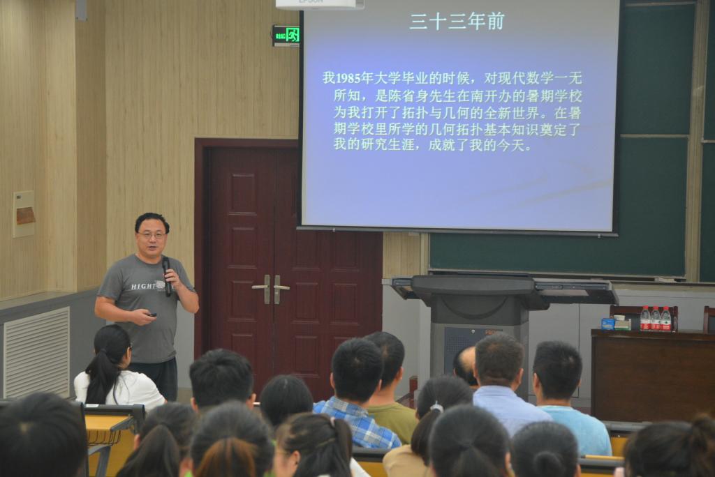 一楼报告厅,刘克峰教授作了题为“New methods in solving equations on manifolds”的学术报告。学院师生代表100余人参加了报告会。报告由我院院长冯淑霞主持。刘教授给大家介绍了他近期的研究成果,一种用整体几何方法来研究Kahler流形上复杂结构的变化。更准确地说,是利用完全Kahler流形上的Hodge理论算子,从而得到了复结构整体变化下全纯正则型的封闭公式,并给出了一般Belrtami方程和Kuranishi障碍方程在复杂结构变形理论中的应用。刘教授在报告中语言幽默风趣,全体师生陶醉其中。报告最后,刘教授回答了师生提出的一些学术问题,并鼓励大家要不畏艰难、坚持梦想、敢于追求。