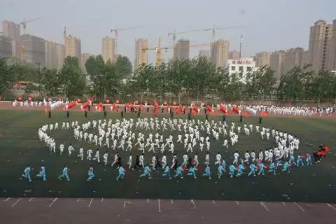 伴随着慷慨激昂的开场曲,我院2018级同学都已蓄势待发。异彩纷呈的太极服衣袂飘飘,既沉稳大气又威风凛凛。方阵排列整齐,动作划一,刚柔并济。舞旗的小伙子们以磅礴的气势,以凌云之态从中间劈出,虎虎生风。舞扇的姑娘们幡随风动,扇下生风。
