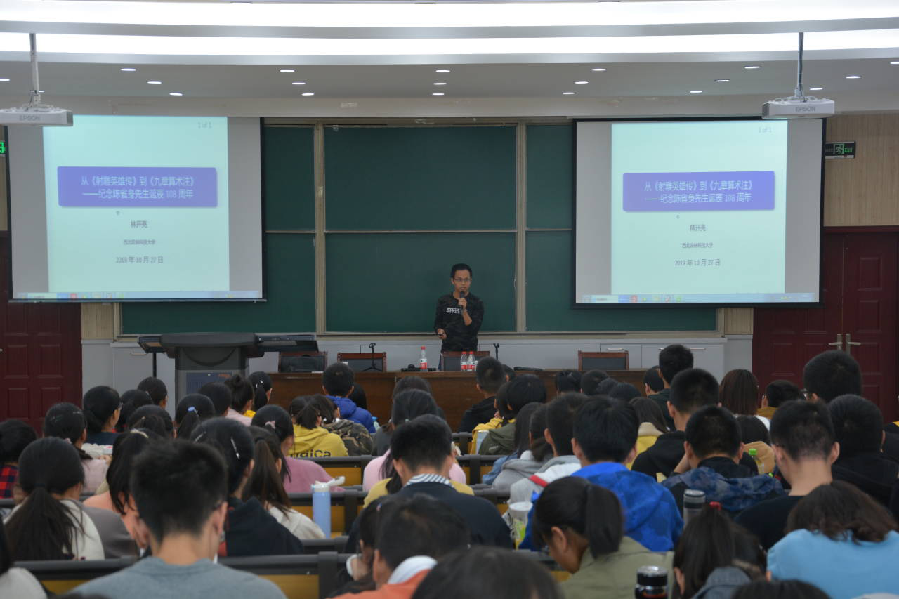 27日下午,林开亮作《从<射雕英雄传>到<九章算术注>——纪念陈省身先生诞辰108周年》专题报告,报告会由学院党委副书记赵红磊主持。报告从《射雕英雄传》廿九回中的情节为切入点,以黄蓉给“神算子”瑛姑出的三道算术难题的第三题“鬼谷算”出发,引入“中国剩余定理”和“求一术”的发展历程,指引学生从刘徽《九章算术注》中找到破解此题的妙招。