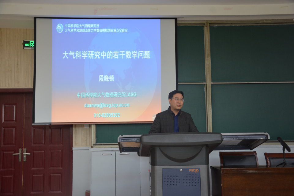 27日上午,段晚锁作《大气科学研究中的若干数学问题》专题报告,报告会由学院副院长王波主持。段晚锁强调了数学在大气科学研究领域的重要性,然后具体介绍了大气科学的含义和基本内容,列举了大气科学研究领域的若干个数学问题并通过著名的“蝴蝶效应”生动直观地向同学们讲述了数学在大气科学领域中所发挥的重要作用。