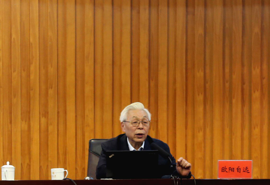 欧阳自远(1935.10.9),天体化学与地球化学家,中国科学院院士,发展中国家科学院院士,国际宇航科学院院士。1960年中科院地质所研究生毕业。现任中科院地化所研究员,国家天文台高级顾问, 贵州省科协荣誉主席。兼任北京大学、中国科技大学、南京大学、中山大学、哈尔滨工业大学、浙江大学等12所高校兼职教授,天津理工大学和贵州大学名誉校长。曾任中国科学院资源环境科学局局长、地球化学所所长,贵州省科协主席,贵州省人大常委会副主任。成果获国家科学大会奖、国家自然科学奖和科技进步奖多项、贵州省最高科学技术奖,中科院自然科学奖一等奖和科技进步奖一等奖、工信部科技进步特等奖、国防科工委个人突出贡献奖、国家科技进步特等奖,全国先进工作者等。在国内外共发表论文590多篇,专著18部,主编著作21部。培养硕士、博士与博士后65人。至今仍然在科研第一线勤奋工作。