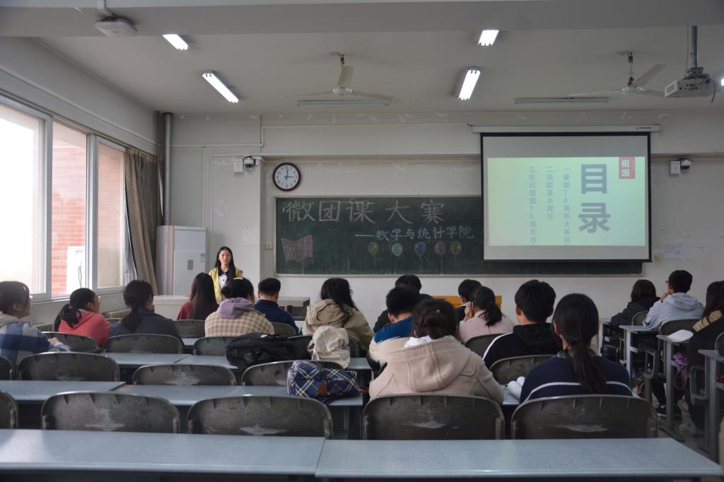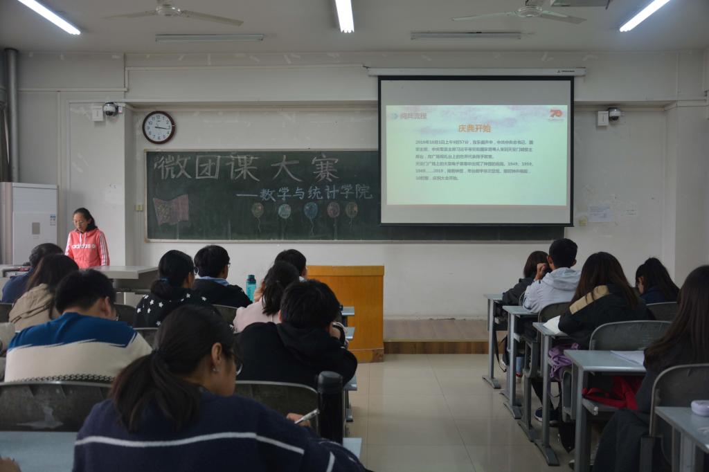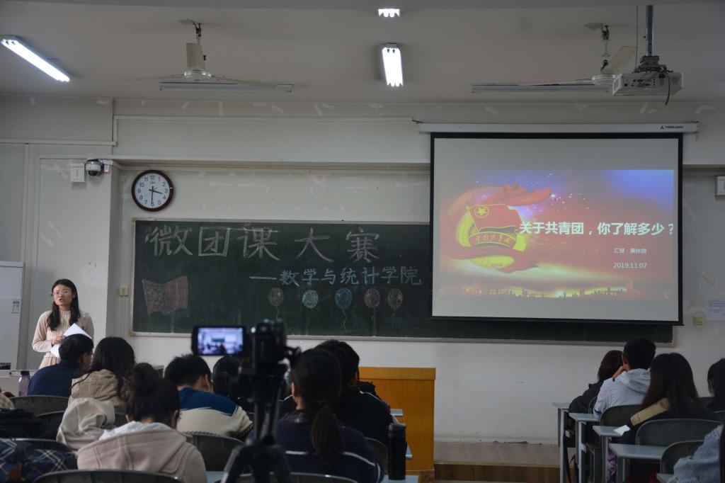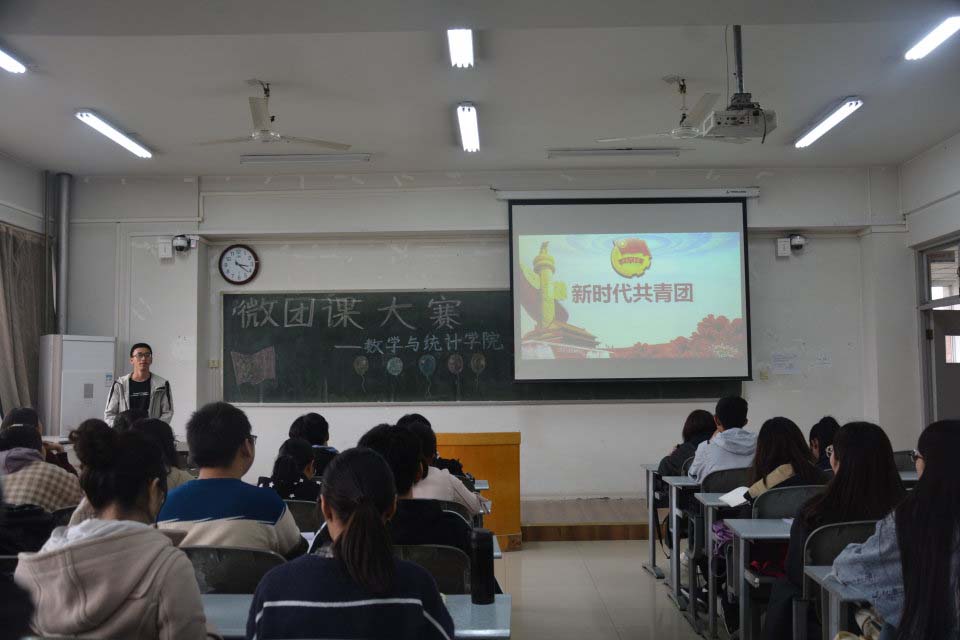 11月7日下午,学院学生团干部在7304教室集中观看了“微团课”大赛初赛展示,参赛的五位团支书分别是来自2017级数学与应用数学(实验班)专业的王裕斐、2018级信息与计算科学专业的陈艳晓、2018级统计学专业黄林微、2019级统计学专业姚翔上、2019级金融数学专业郭铭萱。比赛由2018级羌准准主持。