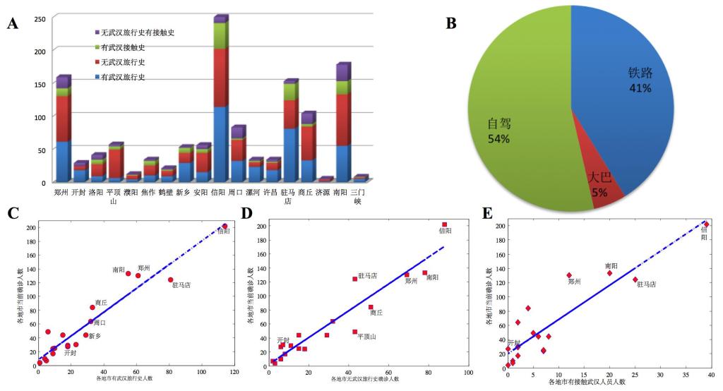 我们同时统计研究了收集到的确诊病例的武汉旅行史及和可疑病例的接触史问题 (见图4)。526例染病者具有武汉旅行史,在各地市的分布如图4A所示;其与各地市目前确诊人数的散点图见图4B. 其中我们搜集的数据中,有250人被公布了交通方式,交通方式基本涉及铁路、大巴和自驾三类,各类占比情况见图4B.