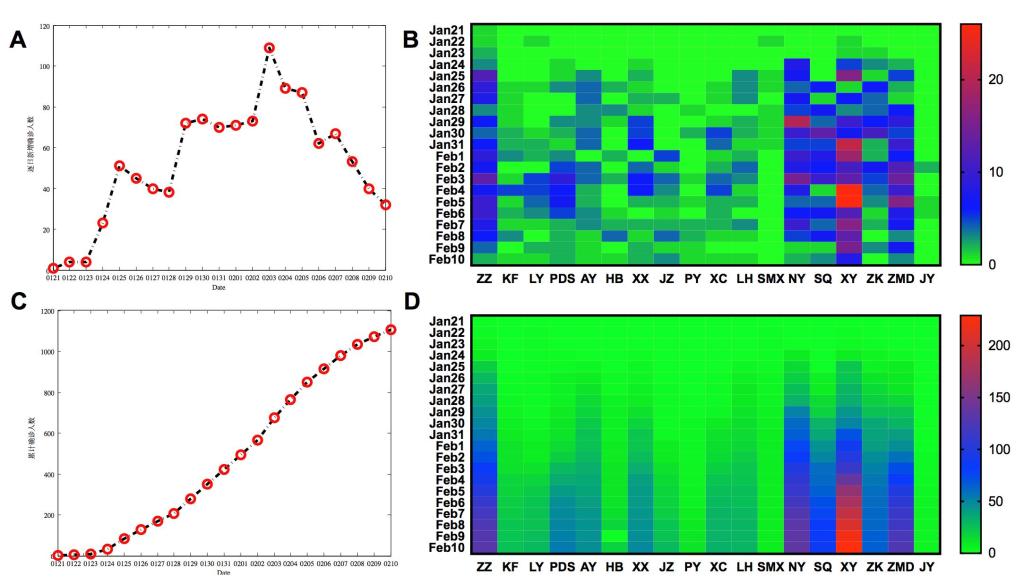 图1:河南省1月21日至2月10日确诊病例人数情况。A. 全省每日新增人数演变;B. 18地市每日新增热图;C. 全省累计确诊人数;D. 18地市累计确诊人数热图。热图横轴为18地市名字首字母缩写。