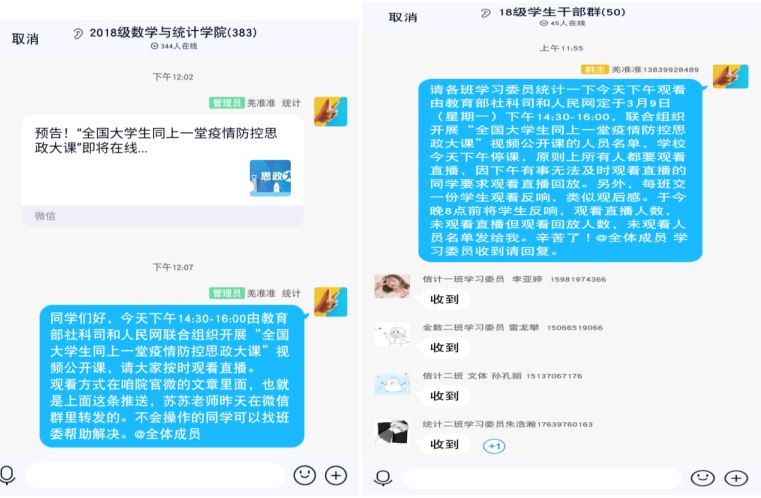 3月9日下午,按照学校“疫情防控思政大课”收看要求,我院认真组织全体本科生和研究生按时收看由教育部社会科学司与人民网联合组织的 “全国大学生同上一堂疫情防控思政大课”在线直播。“疫情防控思政大课”主要解读以习近平同志为核心的党中央关于疫情防控的决策部署,讲述防疫战疫一线感人故事,发挥高校思政课落实立德树人根本任务的关键课程作用。来自清华大学、中国人民大学、北京师范大学和中央财经大学的四位顶级名师在战“疫”特殊时期“云”授课,与广大学子们共同研讨疫情大考告诉了我们什么、战“疫”青年有怎样的责任和担当等话题。同学们观看后,纷纷总结学习心得,交流疫情期间的感受体会。