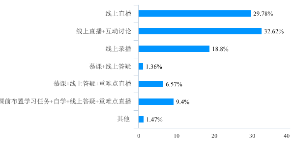 对于线上教学方式的认可度调查中,有62.4%的学生更喜欢任课老师采用“线上直播”或者“线上直播+互动讨论”方式开展教学,也有18.8%的学生对“线上录播”教学方式比较认可,其中同学们对于“慕课+答疑”等方式的认可度较低。这也反映出绝大多数学生还是希望能听到任课老师的亲自讲解和分析。