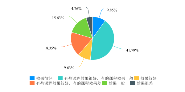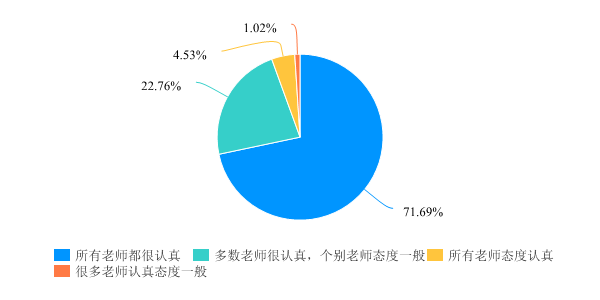对于任课教师教学态度调查中,98.92%的学生对我院任课教师开展线上教学的教学态度和教学效果认可度较高,反映出学院绝大部分任课老师对线上教学工作高度重视,教学态度端正,这也是学院长期以来高度重视本科教学的一次具体体现。