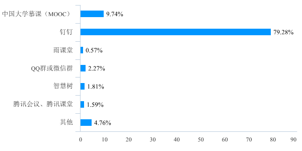 从同学们对线上教学平台的认可度来看,接近80%的同学选择了钉钉直播教学平台,有将近10%的同学选择了中国大学慕课,选择其他教学平台的学生人数较少,这也与学院绝大多数任课老师选择钉钉平台进行直播教学的状况相一致。