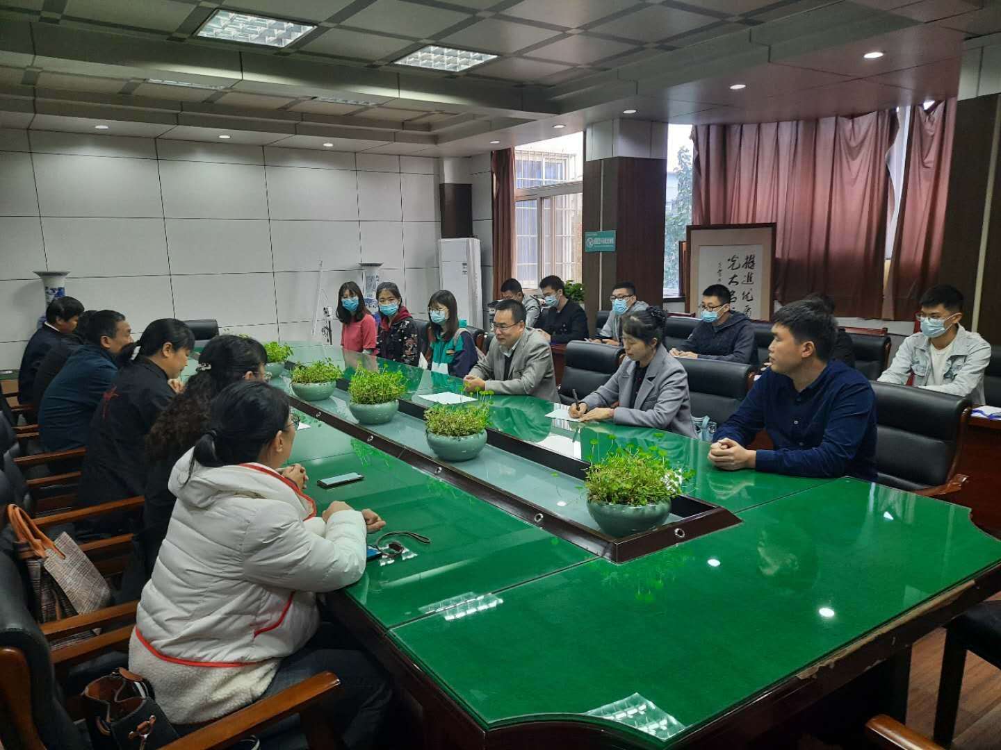 在开封市第二十五中学,数学教研组组长陈君带领数学组其他老师一起对学院带队老师和10名实习学生表示了欢迎。陈君介绍了学校数学组师资队伍和教学工作的基本情况,并对实习工作具体开展计划进行了周密部署。解俊山介绍了学院师范生培养工作基本情况和教育实习的目的,还就师范生培养方面的深度合作与交流方面同二十五中各位参会老师进行了探讨,双方都表示将在实习基地建设、教育教学、师范生培养和教研科研等方面开展进一步合作。