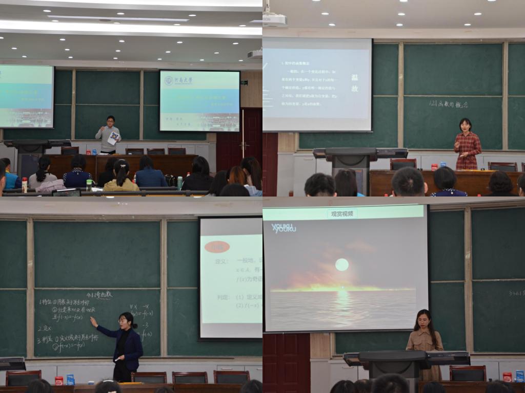 选手张帆通过“奥运金牌第一人许海峰射击”的故事引入点和圆的位置关系,让大家在趣味探索中明白射击记分与数学的联系;选手张园园通过设定“函数小镇”的情景引入课程,以小组讨论方式让同学们自主观察变量关系,理解函数的概念;选手胡书雅以生活中的实际图形:如汽车标牌、中国移动的Logo来引入奇函数图像,通过启发引导的方式带领学生学习奇函数的特征,充分体现了教师主导、学生主体的教学观;选手冯琪琪通过带领观看视频“海上日出”,让学生直接体会直线和圆的位置关系,教学设计受到了评委老师的一致好评。