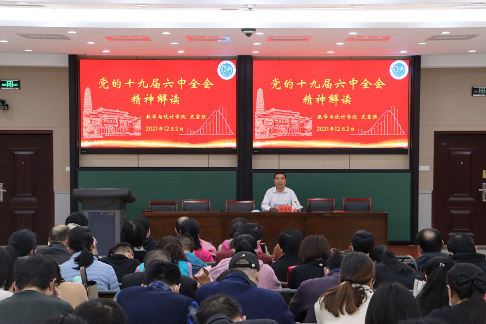 党委书记史富强在学院南阶梯教室为全体师生党员作题为《党的十九届六中全会精神解读》的专题报告。