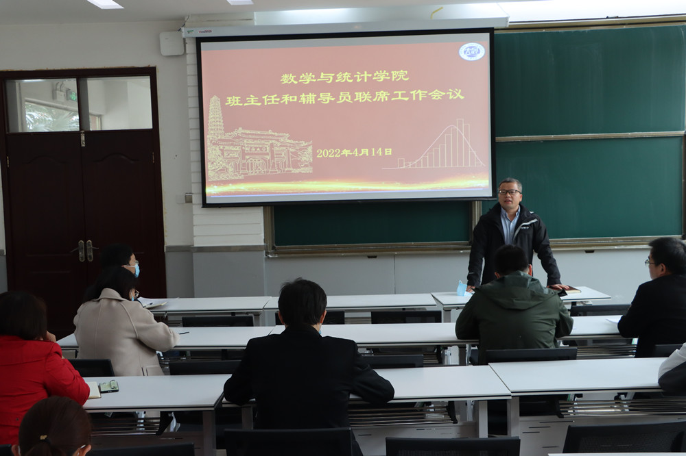 在一楼报告厅召开本科生班主任和辅导员联席工作会议,院长韩小森、党委副书记赵红磊、副院长王波、解俊山、唐恒才和各年级班主任、辅导员参会。