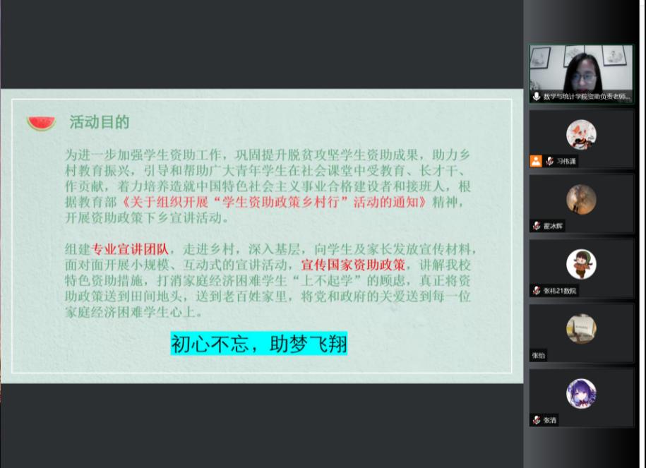 7月11日,学院资助工作负责老师贾丽冰开展了以“初心不忘,助梦飞翔”为主题的“资助政策乡村行”线上启动会,她就宣讲活动的目的、资助政策的宣传内容、活动形式等方面给13名宣讲成员进行了简要说明,鼓励他们积极开展宣传,帮助更多家庭经济困难的学生了解国家资助政策。