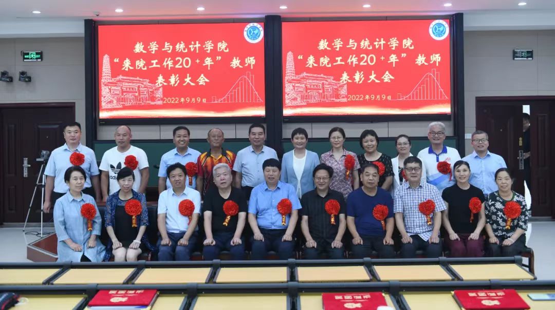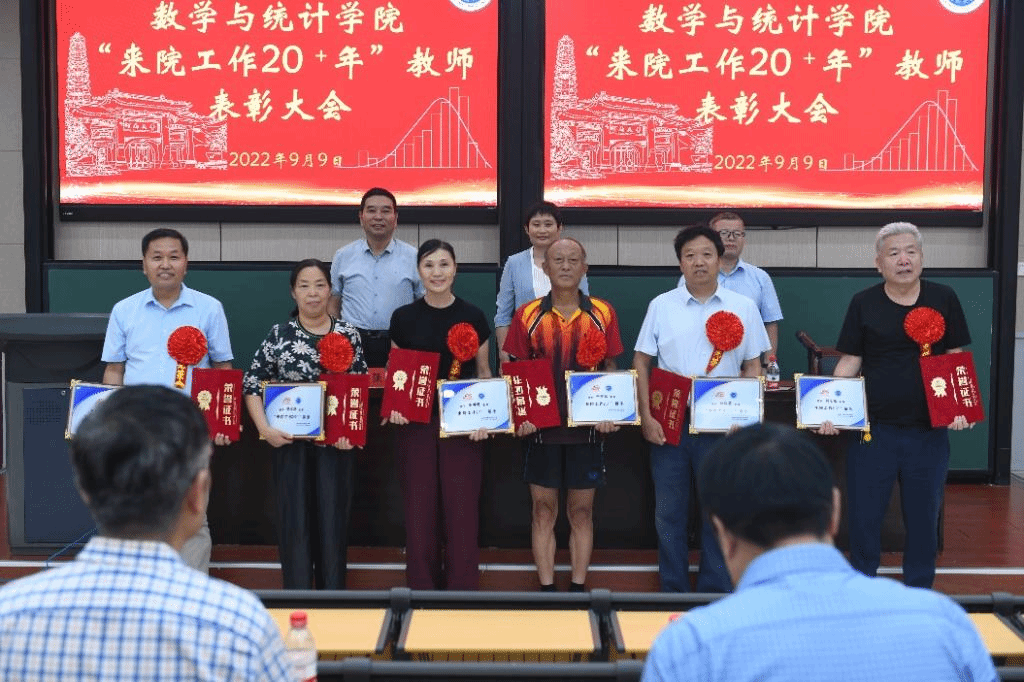 委员会关于表彰“来院工作20+年”教师的决定》。伴随着欢快的乐曲,与会领导为戴着大红花的受表彰教师颁发荣誉证书和奖杯,并合影留念,会场气氛热烈又温馨。