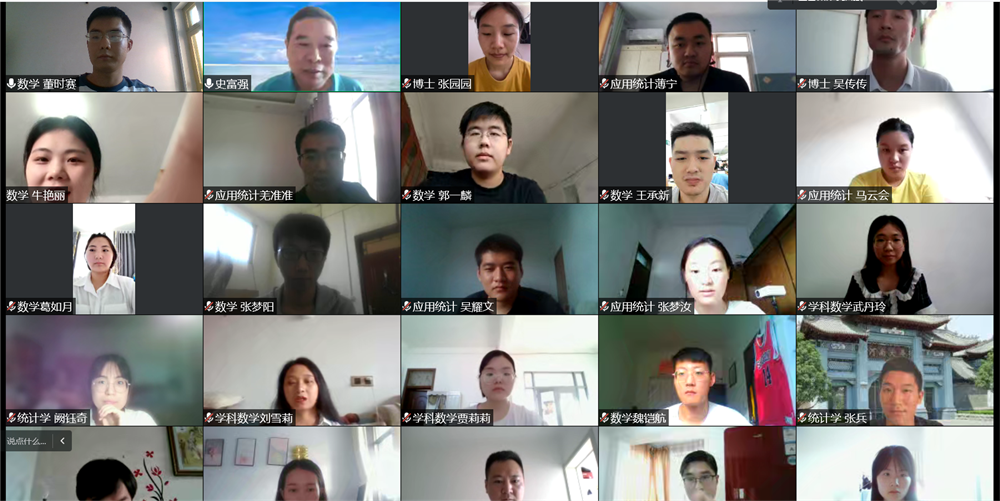 辉煌的历史、艰难曲折的发展道路以及逐步复兴的历程。然后以学院的发展史为切入点,详细介绍了黄际遇、陈作钧、樊映川、黄敦慈、杜孟模、刘亚星等先后在学院执教的著名数学家和教育家,他们为学院的发展作出了巨大贡献,令同学们身临其境,感受颇深。最后,史富强勉励同学们要加强体育锻炼,在学习生活中养成独立思考、解决问题的能力,提升自身综合素质,努力成为创新型、应用型、复合型优秀人才。会议结束时,史富强与同学们“云”合影留念。