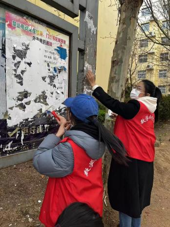 21号家属院内墙面、楼道、电线杆等处的小广告进行逐一清理;经过两个小时的劳动,小区内面貌焕然一新,她们忙碌的身影,成了小区里一道亮丽的风景线;通过劳动,同学们的文明意识、环保意识进一步增强。