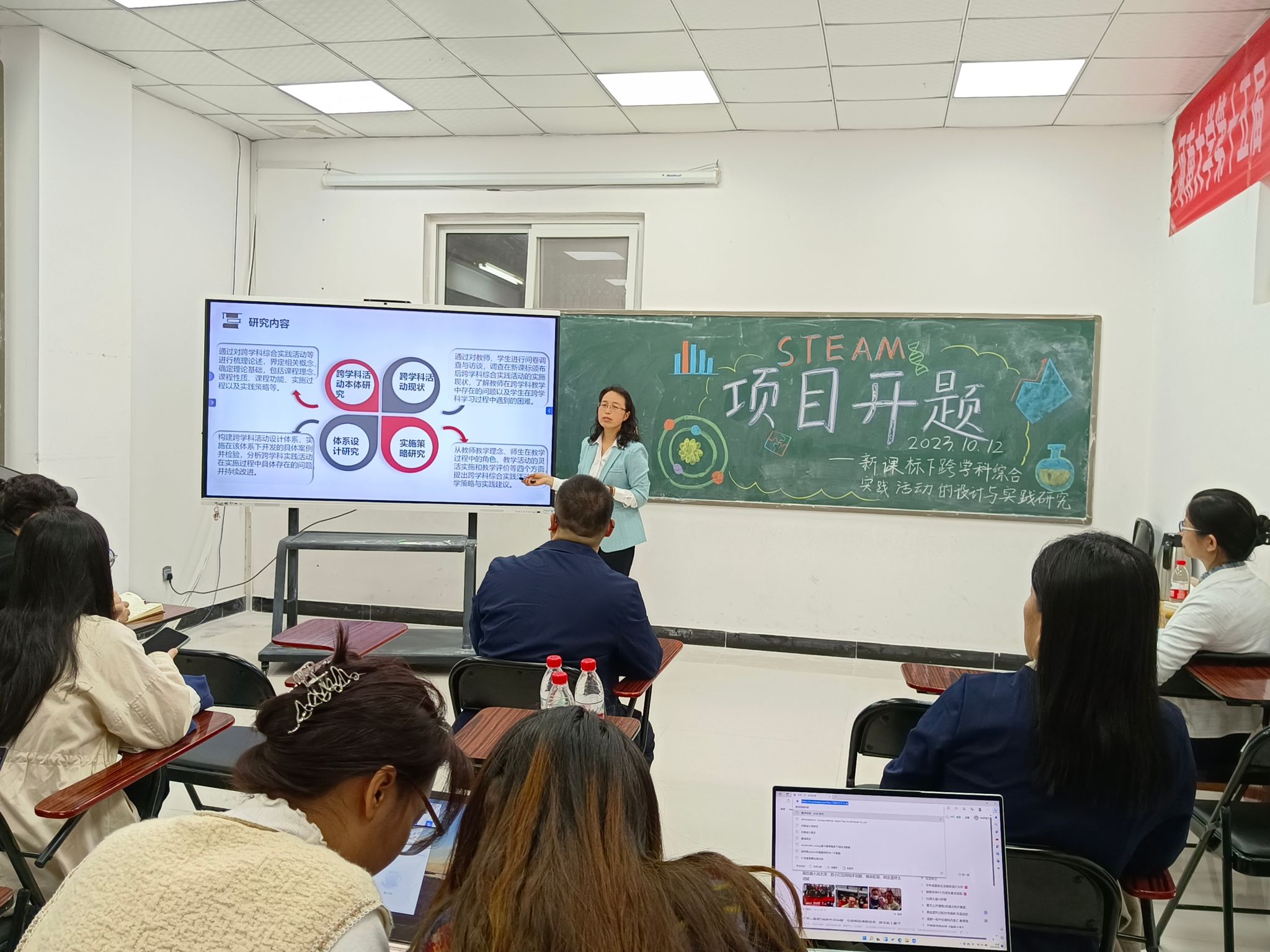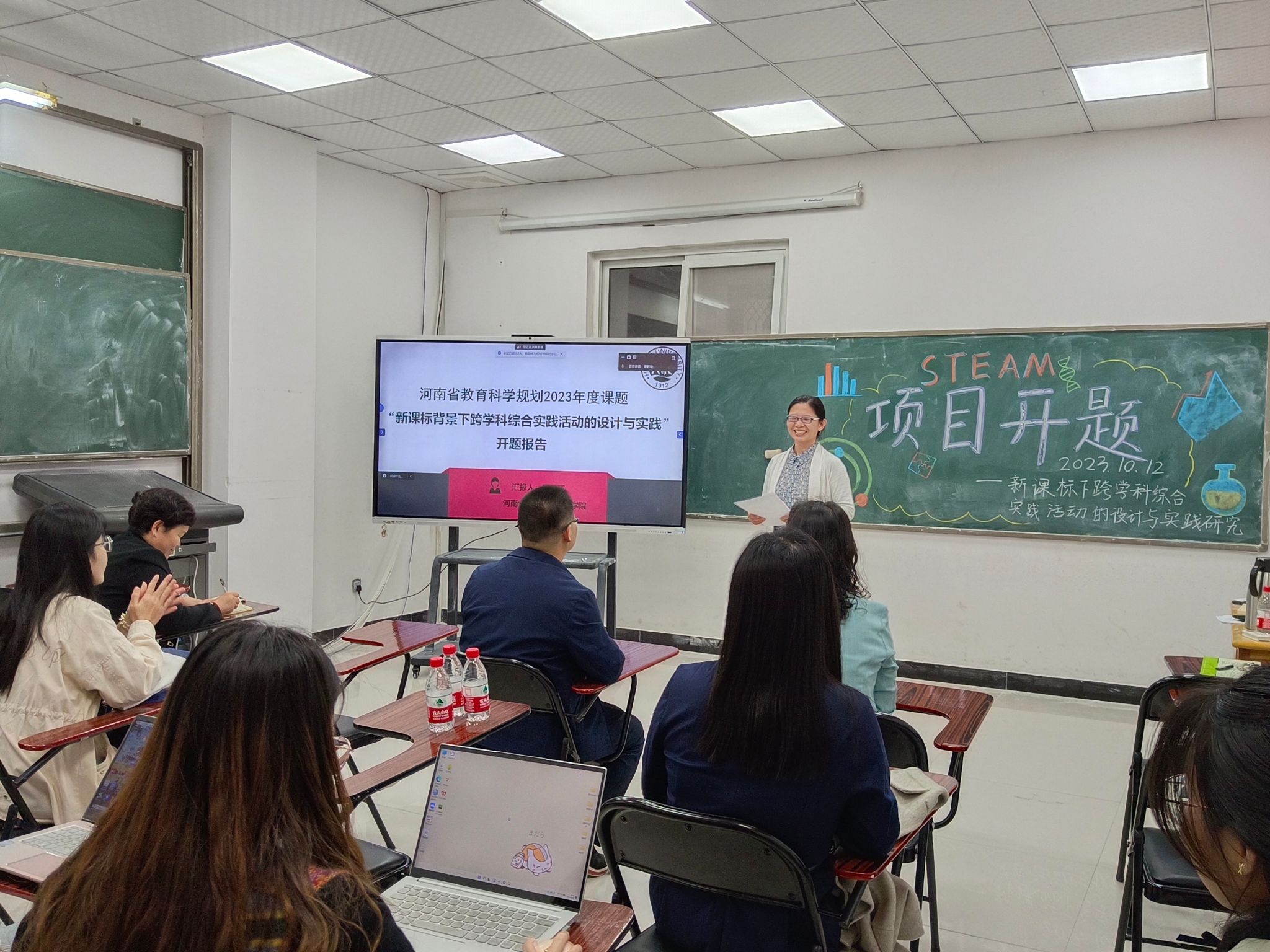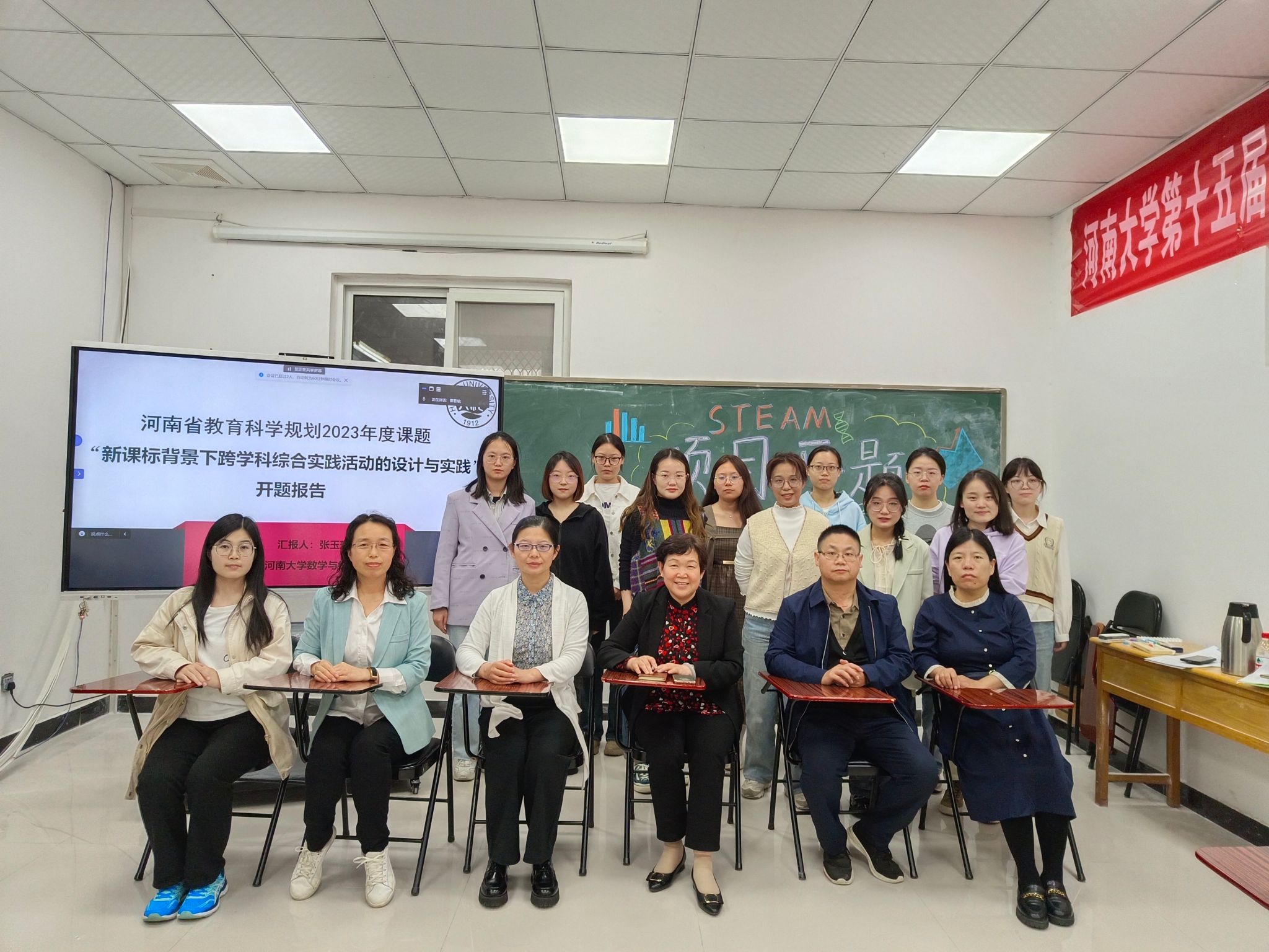 在北研教室,组织开展张玉环主持的河南省教育科学规划2023年度课题“新课标背景下跨学科综合实践活动的设计与实践研究”开题论证会。本次会议由范利萍主持,评议专家王慧君、尹彦彬、程俊芳受邀出席,参与人员还有白胜南、课题组成员、数学教育、学科教学(数学)方向的研究生和2020级数学与应用数学专业本科生。