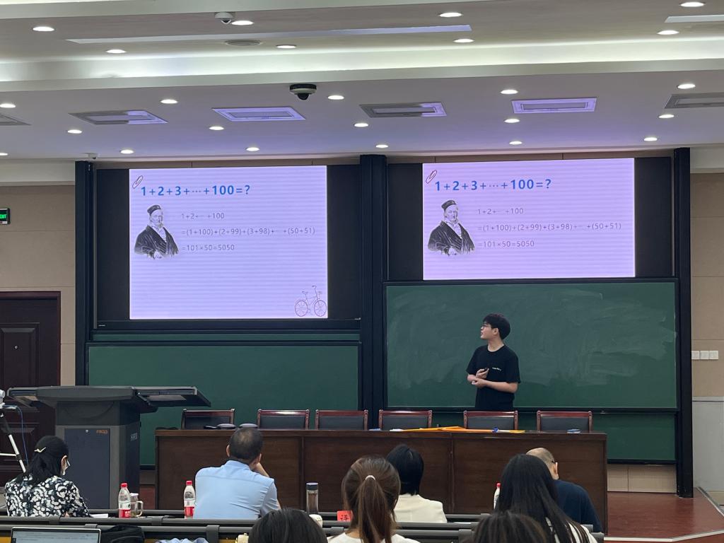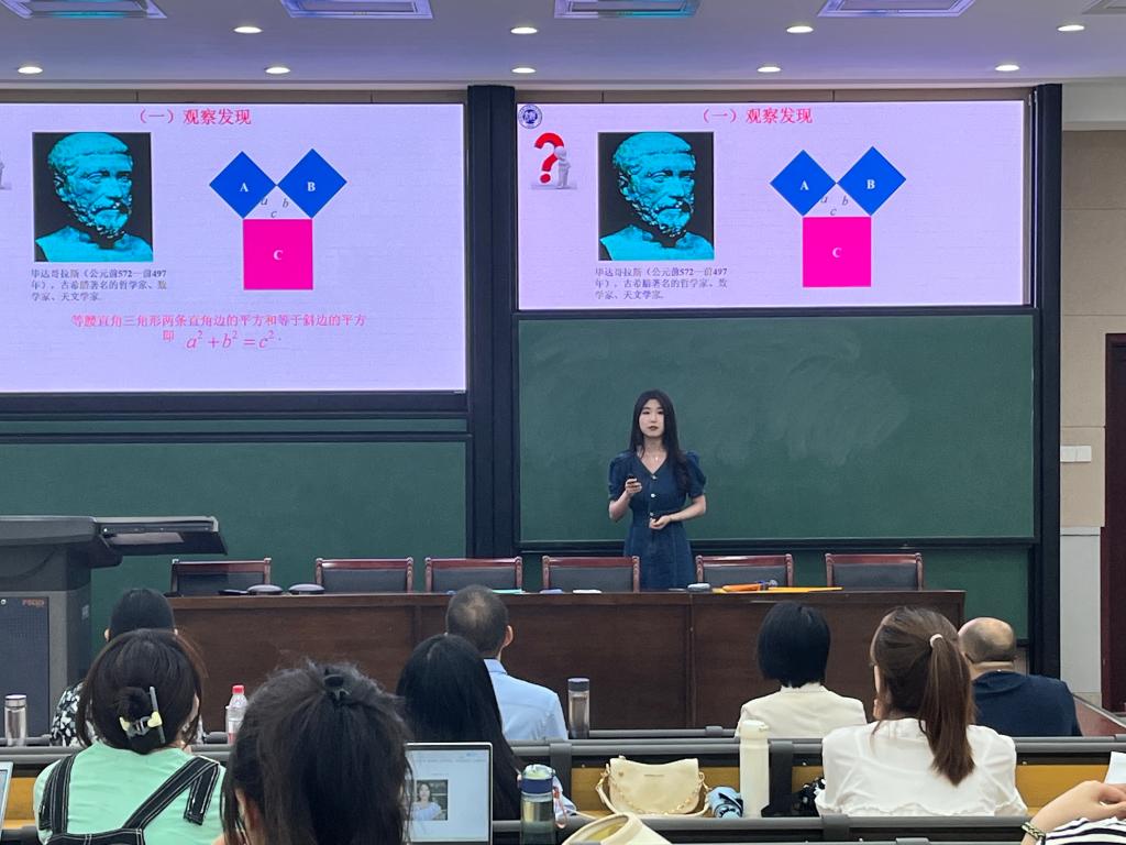 在初赛阶段,由上一届研究生教学技能大赛的五位获奖者担任评委进行现场评分。参赛者在比赛过程中,运用亲切的语调,巧妙的教学设计,多元化的教学工具辅助教学,将参赛章节如《勾股定理》、《等比数列求和公式》等教学内容深入浅出地展现到评委和现场观众眼前,经过初赛的激烈角逐,15位选手脱颖而出,入围决赛。