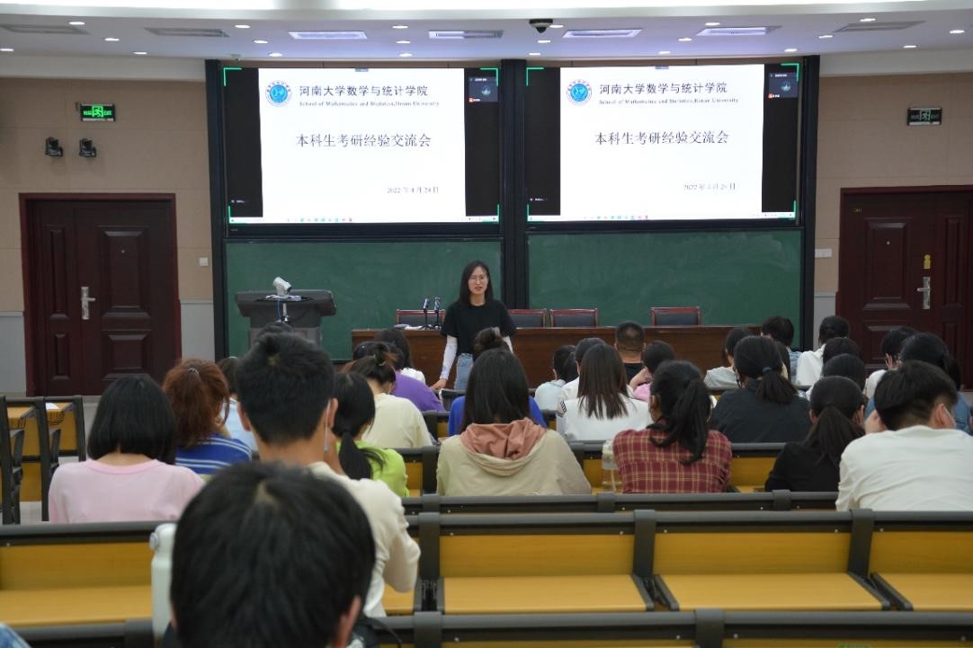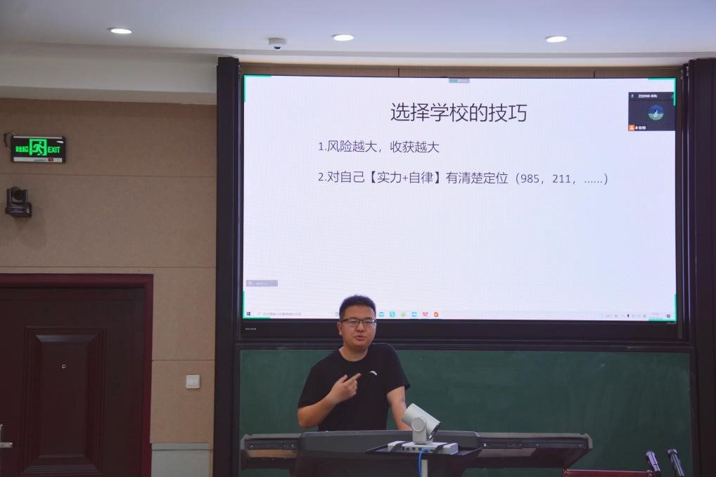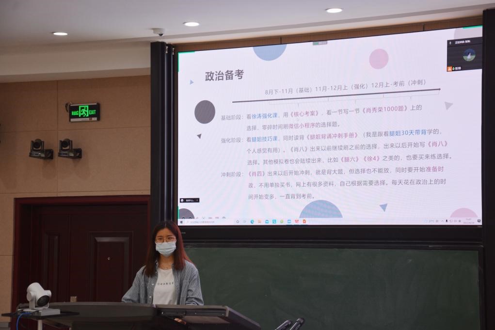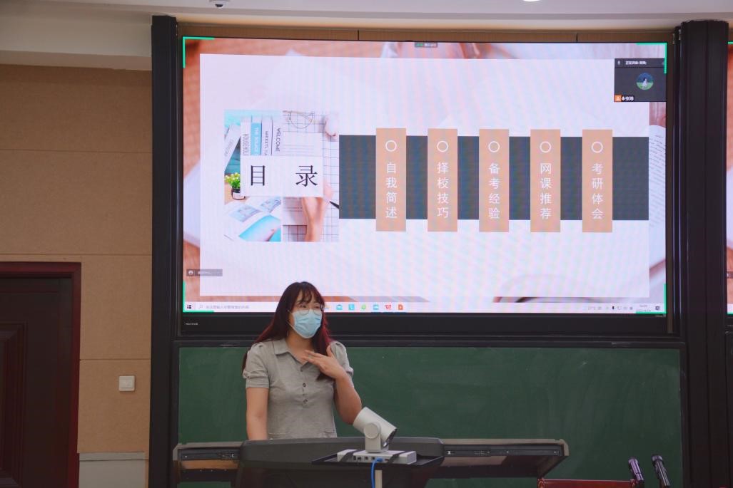 在南阶教室举办了考研交流会。本次会议以线上线下相结合方式进行,共邀请了学院2018级8名优秀考研学长学姐分享经验和心得体会,2019级百余名本科生参加了本次交流会。会议由2019级辅导员贾丽冰主持。