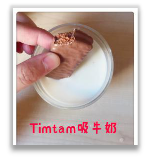 katherine给我们布置的作业,根据老师提供的吃法,课下吃澳洲最有名的巧克力饼干Timtam。吃法是:把Timtam对角线咬两口,然后再吸一口咖啡或者牛奶。我尝试了一次,口味超棒!