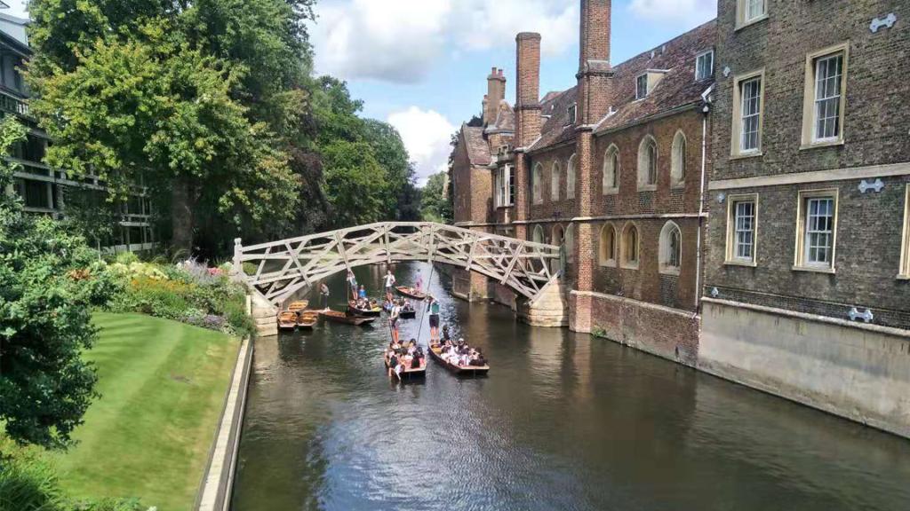 后来去剑桥大学,我们体验了剑河泛舟。一条条古朴的小船,撑船的是剑桥大学兼职的暑假工,我们在波光粼粼的剑河上乘着小船,看着撑船学姐熟练优雅的动作,驶过数学桥,再过康桥,仿佛看到了徐志摩在康桥上漫步而过,吟诵着那首《再别康桥》。河边的风光让我们沉醉,绿树成荫,还有平坦的草地,时不时还有几只小鸭子追逐着我们的船只,一切都是那么美好。