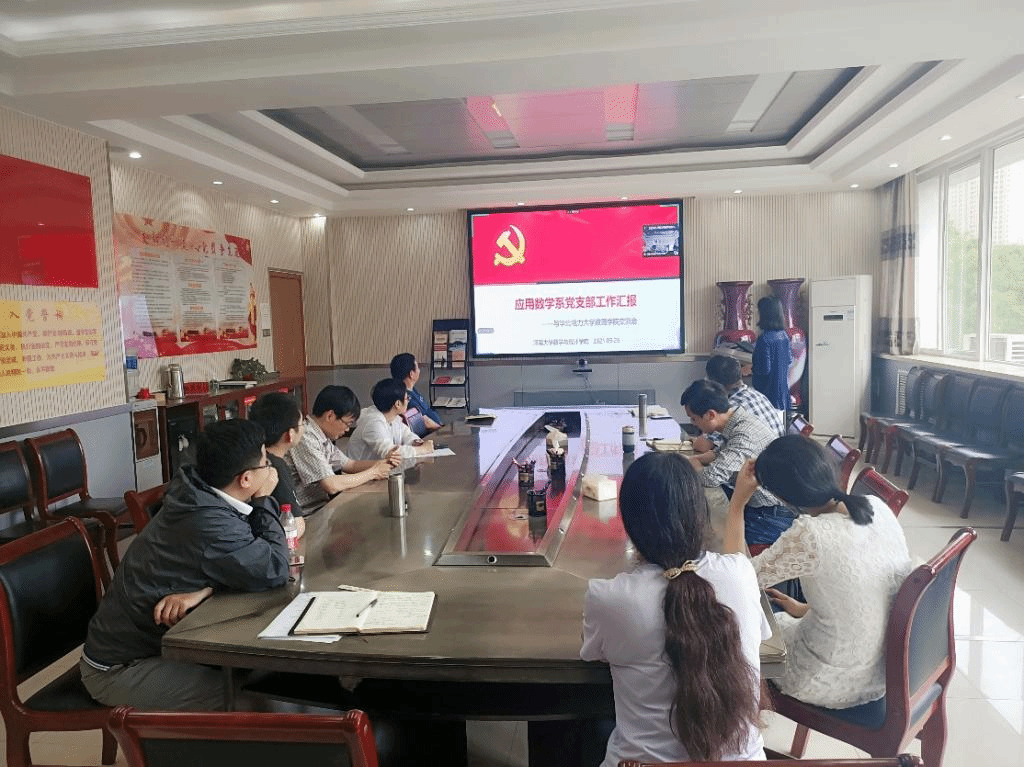 的发展历程及目前的办学情况。吴万凯就数理学院出席人员及学院党建和业务相关情况作了简单介绍。随后,应用数学系党支部书记范利萍就该支部的党建工作开展情况进行了汇报,分享了近年来支部在党建工作中取得的成绩和心得体会,指出党建工作的主要进步体现在支部工作的制度化、常态化、严格化,以及活动形式的多样化,注重学习和活动的实效性,力争用思想价值引领业务实践,增强支部凝聚力和战斗力。双方就新时期高校基层学院党建工作中遇到的困难和问题进行了交流探讨,并提出工作设想和展望。