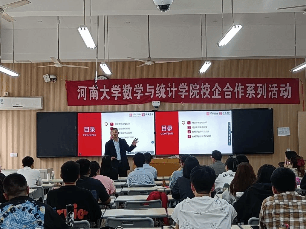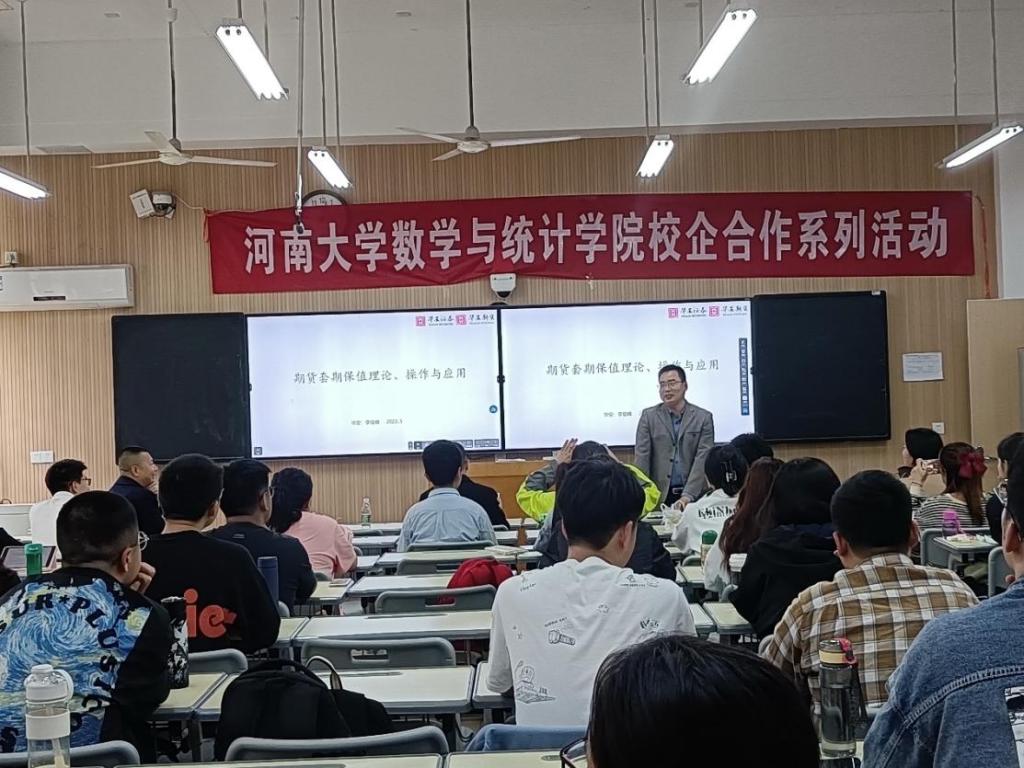 开展校企合作——行业知识培训活动,在金明综合楼3103教室为金融数学专业学生做了一场题为《期货套期保值的理论、操作及应用》的精彩讲座。学院副院长解俊山、金融数学系主任张嘉防、金融数学系教师何妍等60余名师生参加了活动。活动由何妍主持。