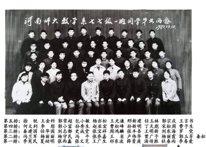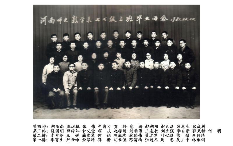 有了排名,系里开始征求意见,书记和主任亲自和每一位同学谈话。轮到我时,平时一向严肃的书记微笑着对我说:“你学习成绩很优秀,我们准备把你分配到大学工作,也可能就留在本校,你有什么意见吗?”她还告诉了我一个秘密:“四年前招生时,因为你父亲正在隔离审查,我们招不招你都符合政策,看了你的档案,知道你在农村表现不错,经研究才决定录取。”后来我才知道,负责数学系招生的还有陈顺卿主任和马国强老师,在那个讲政治的年代,能下这个决心一定很不容易。感谢开封师院,感谢数学系,在我最无助最困难的时候接纳收留了我!