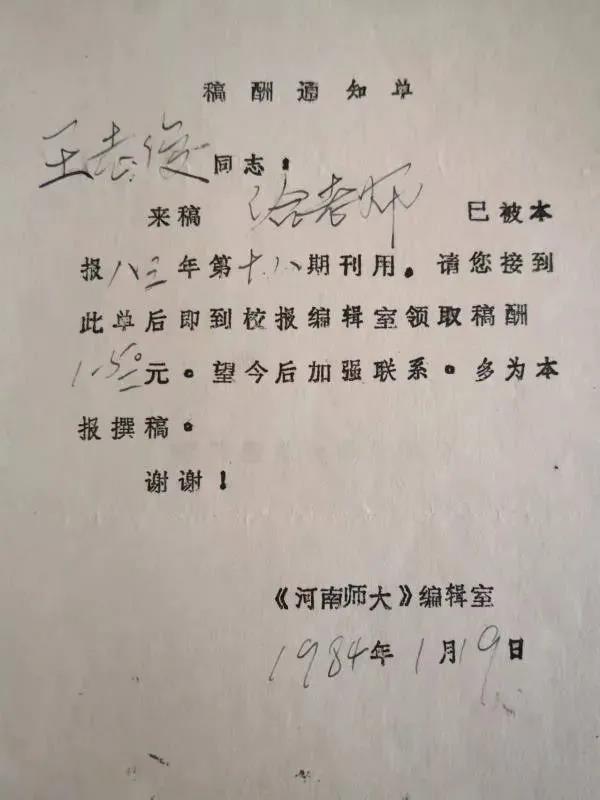 (时名河南师大)校报编辑室发的稿酬通知单,时间是1984年1月19日: