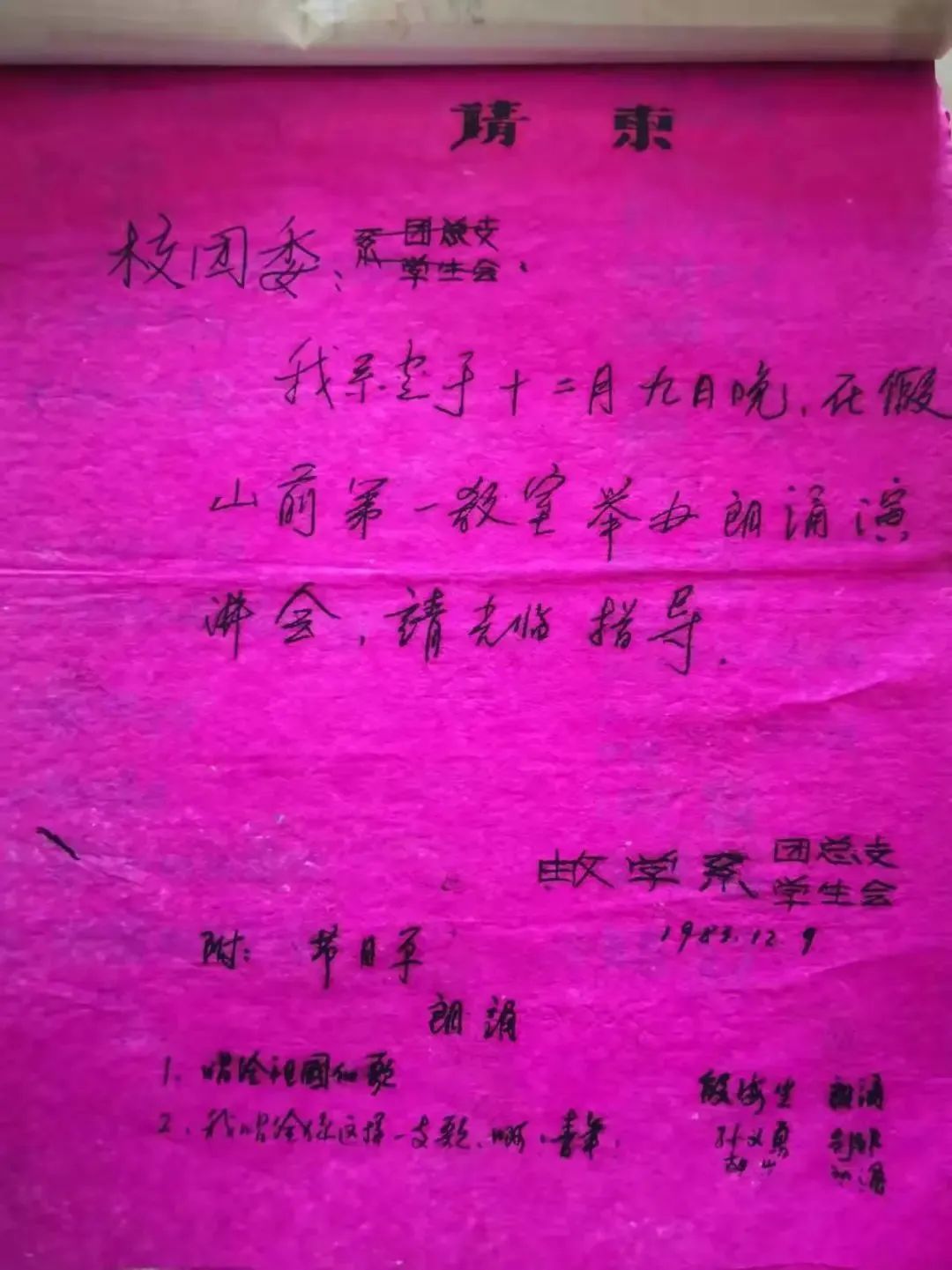 系领导对我的工作给予肯定和鼓励,同学们也给力相助。1983年9月5日,在全校八三级新生开学典礼上,我被推举为在校学生代表致《祝你们奋飞》的欢迎辞。1984年4月,我作为数学系代表参加学校第九次团代会暨第八次学代会。