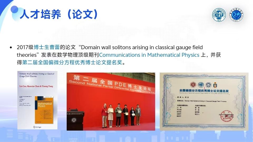 2017级博士生曹蕾的论文“Domain wall solitons arising in classical gauge field theories”发表在数学物理顶级期刊Communications in Mathematical Physics 上,并获得第二届全国偏微分方程优秀博士论文提名奖。