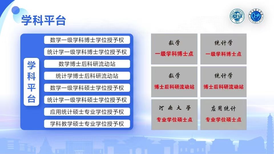 学院拥有数学和统计学两个一级学科博士学位授权点和博士后科研流动站,学科教学(数学)和应用统计两个专业硕士学位授权点。学院开设有数学与应用数学、信息与计算科学、统计学、金融数学等四个本科专业以及 “明德计划”数学与应用数学专业拔尖人才实验班。
