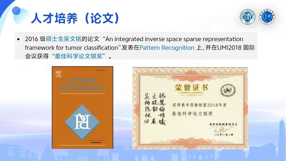 2016 级硕士生吴文铭的论文“An integrated inverse space sparse representation framework for tumor classification”发表在Pattern Recognition 上,并在UMI2018 国际会议获得“最佳科学论文银奖”。